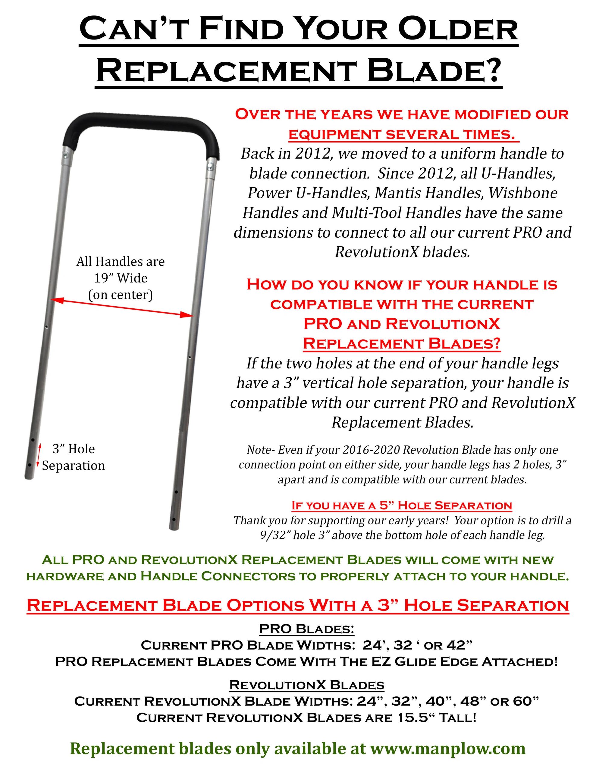 If your blade was built prior to 2012, you have a 5” hole separation. The MANPLOW U Handle dimensions have not changed. You can still get a redesigned PRO Replacement Blade or RevolutionX Replacement Blade but would need to drill out a hole in your handle, 3" above the bottom hole, for the new blade to attach to it.